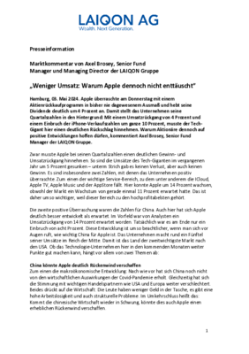 Zum einen die makroökonomische Entwicklung: Nach wie vor hat sich China noch nicht von den wirtschaftlichen Auswirkungen der Covid-Pandemie erholt. Gleichzeitig hat sich die Stimmung mit wichtigen Handelspartnern wie USA und Europa weiter verschlechtert. Beides drückt auf die Wirtschaft: Die Leute haben weniger Geld in der Tasche, es gibt eine hohe Arbeitslosigkeit und auch strukturelle Probleme. Im Umkehrschluss heißt das: Kommt die chinesische Wirtschaft wieder in Schwung, könnte dies auch Apple einen erheblichen Rückenwind verschaffen.